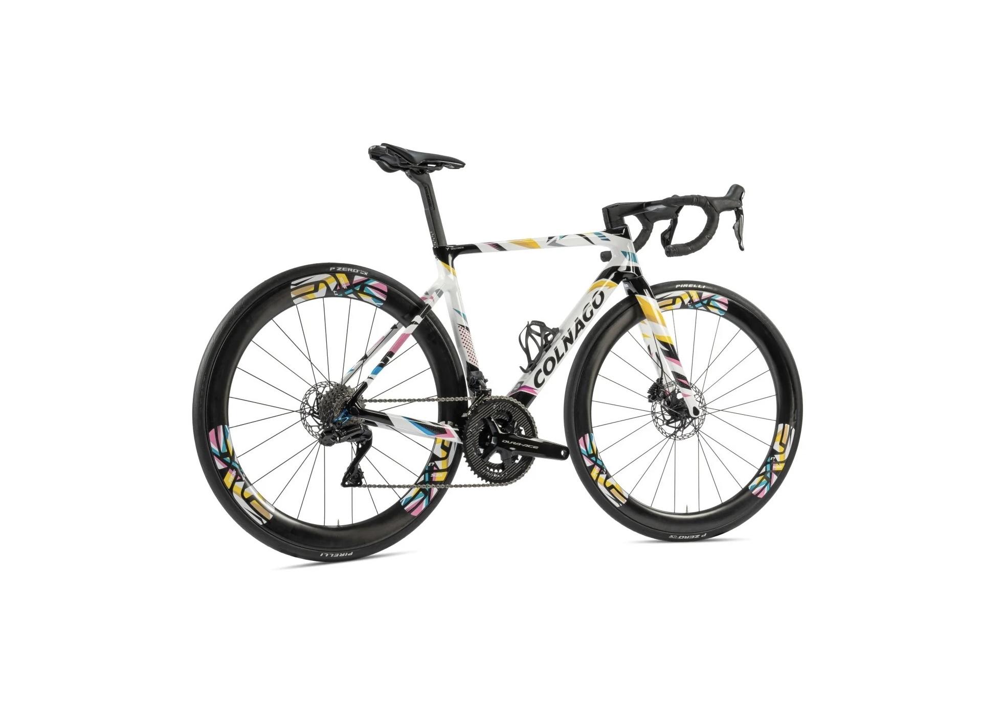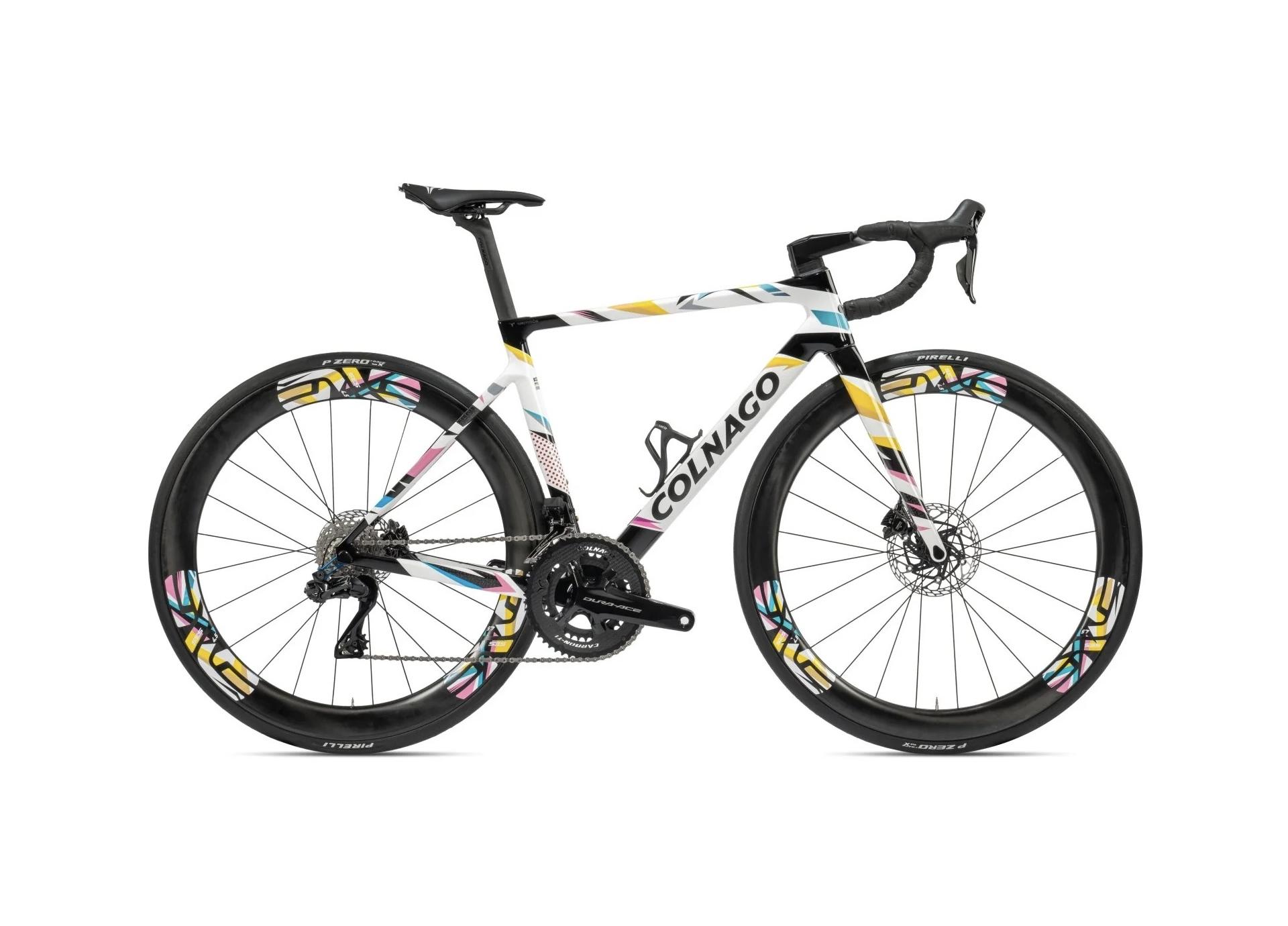 This Colnago bike is a limited edition of the V4Rs, the bike currently used by UAE Team Emirates. It is distinguished by its colorful, eye-catching paint scheme, embellished with graphic elements that evoke Tadej Pogačar's countless successes in the saddle of a Colnago: yellow for his three Tour de France victories, pink for the Giro d'Italia, polka dots for the Tour's best climber jersey, white for the best young rider jersey, green for the Tour of Lombardy and Liège-Bastogne-Liège.... The references are endless, forming a veritable kaleidoscope of victories.
